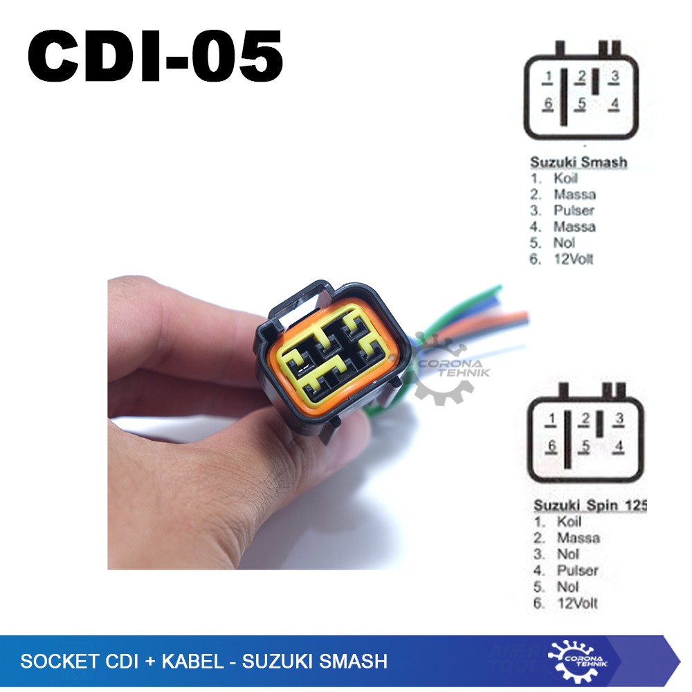 Soket ini memiliki fungsi untuk mengalirkan arus listrik ke unit CDI sesuai dengan kebutuhan mesin. Soket CDI Suzuki - Pada pengapian CDI atau capasitor discharge ignition terdiri dari beberapa kabel dan komponen yang membentuk sebuah rangkaian sistem pengapian. Meskipun ada persamaan dengan beberapa jenis motor.
